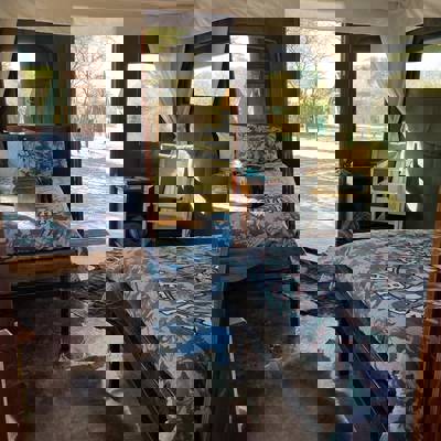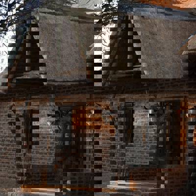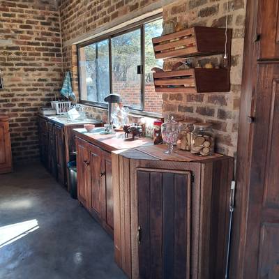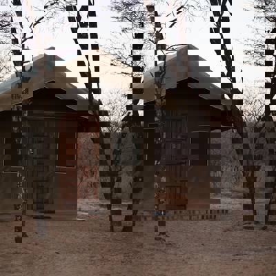 Accommodation in the form of 2 luxury tents with en suite bathrooms, equipped with a shower and toilet, hot water coming from a “donkey” (wood heater). 1 Luxury brick built chalet with an en suite bathroom with a toilet and shower. The lodge includes a kitchen, dining area, lounge with a fire place and a bar.
