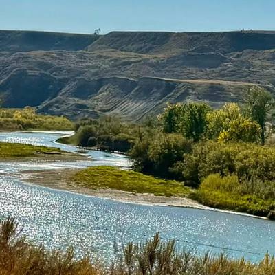 A beautiful stretch of winding river lined with towering cottonwood forest, thick brush, and protected bedding areas.