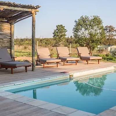 Accommodation is in the form of 5 private cottages sleeping 2, each with a lounge area and fireplace. A private bathroom. The central entertainment area is where meals and drinks are served, either inside or under the stars. The swimming pool is also in this area with sun-loungers.