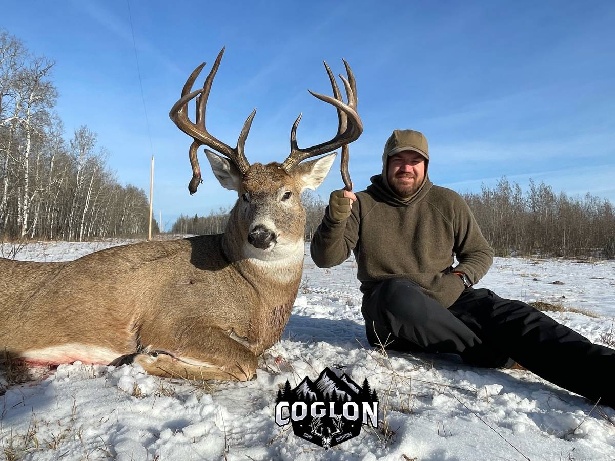 We Outfit in what is arguably the best location to grow giant bucks. Located 2.5 hrs north east of Edmonton on the Saskatchewan border. Our country includes a mix of farmland, pasture and big bush country. Mixed with great genetics the quality of feed available and the fact that deer can hide in the big timber and grow old consistently produces big bucks. In 2024 we averged 155" bucks with a 95% opportunity rate on deer 145" or better. If you can stay off the trigger you willl have a good opportunity to hunt 165"+ deer. I'm Colbie Coglon, i've been in the Hunting industry for 14 years this season guiding, outfitting and flying in the Yukon, Northern BC and Alberta. I know what it takes to deliver high end hunts to hunters expecting the BEST. My Wife Jaynell and I own a large ranch right in the middle of our hunting territory. Its here the main lodge is located. Being located in the area is HUGE. Owning and leasing a big chunk of land gives us unprecedented access to some of the best land. Short travel to and from the blinds make for enjoyable evenings in the lodge sharing stories and enjoying the atmosphere that is "deer camp".