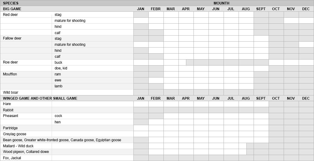 The main hunting season starts in September, when the red stag and mouflon seasons open. You can also hunt ducks during this time. In October, you can add fallow deer to the list. October also marks the opening of the small-game seasons. Driven hunts for wild boar are typically conducted from November to January. However, you can hunt wild boar all year round. Boar hunts can be especially productive during the summer, when most hunting is conducted on agricultural lands, but stalking and stand hunting can be good in the fall as well.