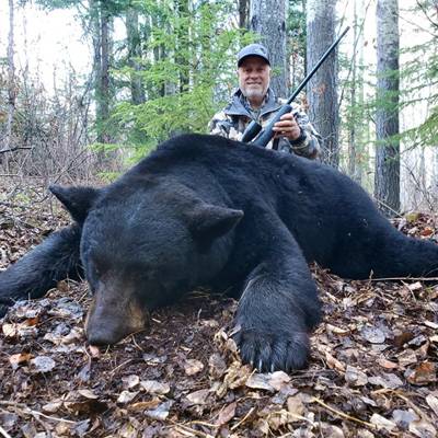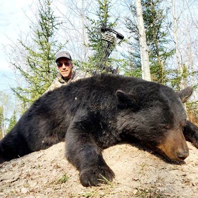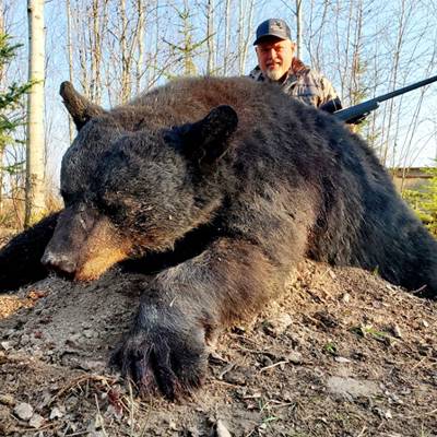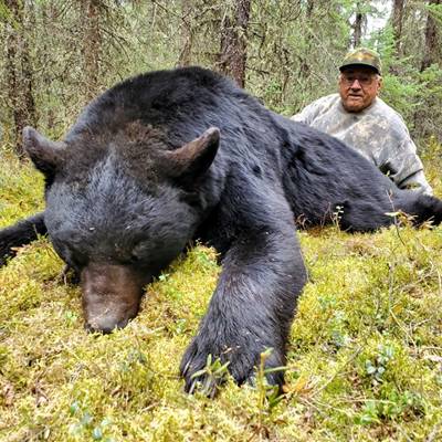 This is a bait hunt using archery, muzzle loader, rifle, or cross bows and all stands are situated 15-20 yards from the bait site. This is a remote hunt, camp and all bait stations are only accessible by 4x4 trucks & ATV’s. We are very particular on the bears we harvest, our lasy 4 year average has been 7’ squared with 90% making the P&Y Minimum. Colored bears run about 15% in our area. We only harvest large mature bears that square better than 6’8”. We will put you on a TROPHY BEAR!